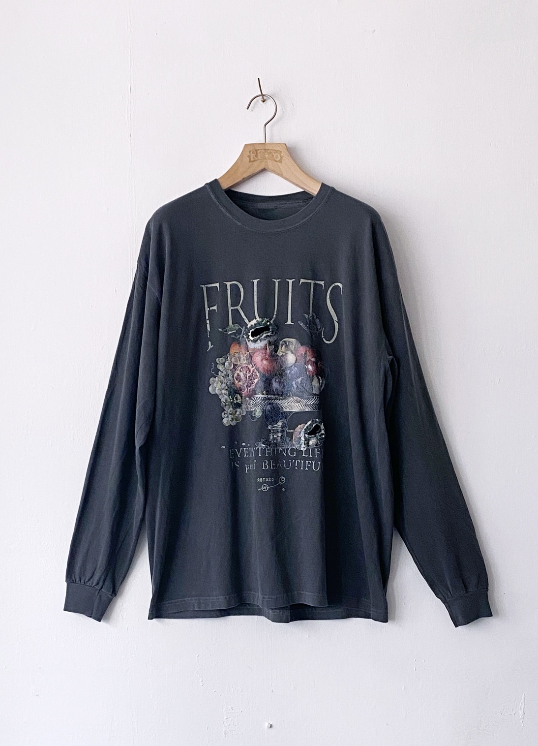 FRUITSのプリントには、刺繍技術で表現したカビがところどころに穴を開けています。青カビと白カビの感じがなんとも言えない印象を与えています。