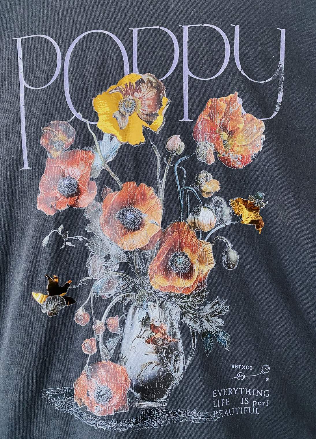 POPPYのプリントには箔プリントが施されています。着用するにつれて剥がれていくことを意図したアイテム。