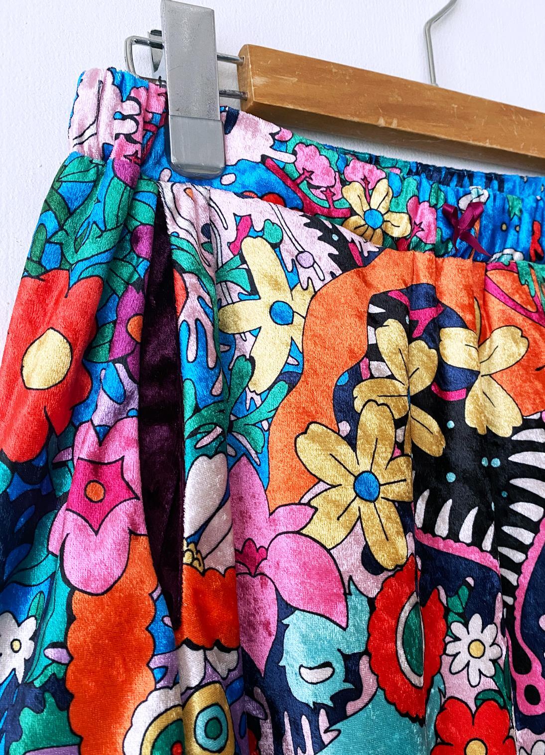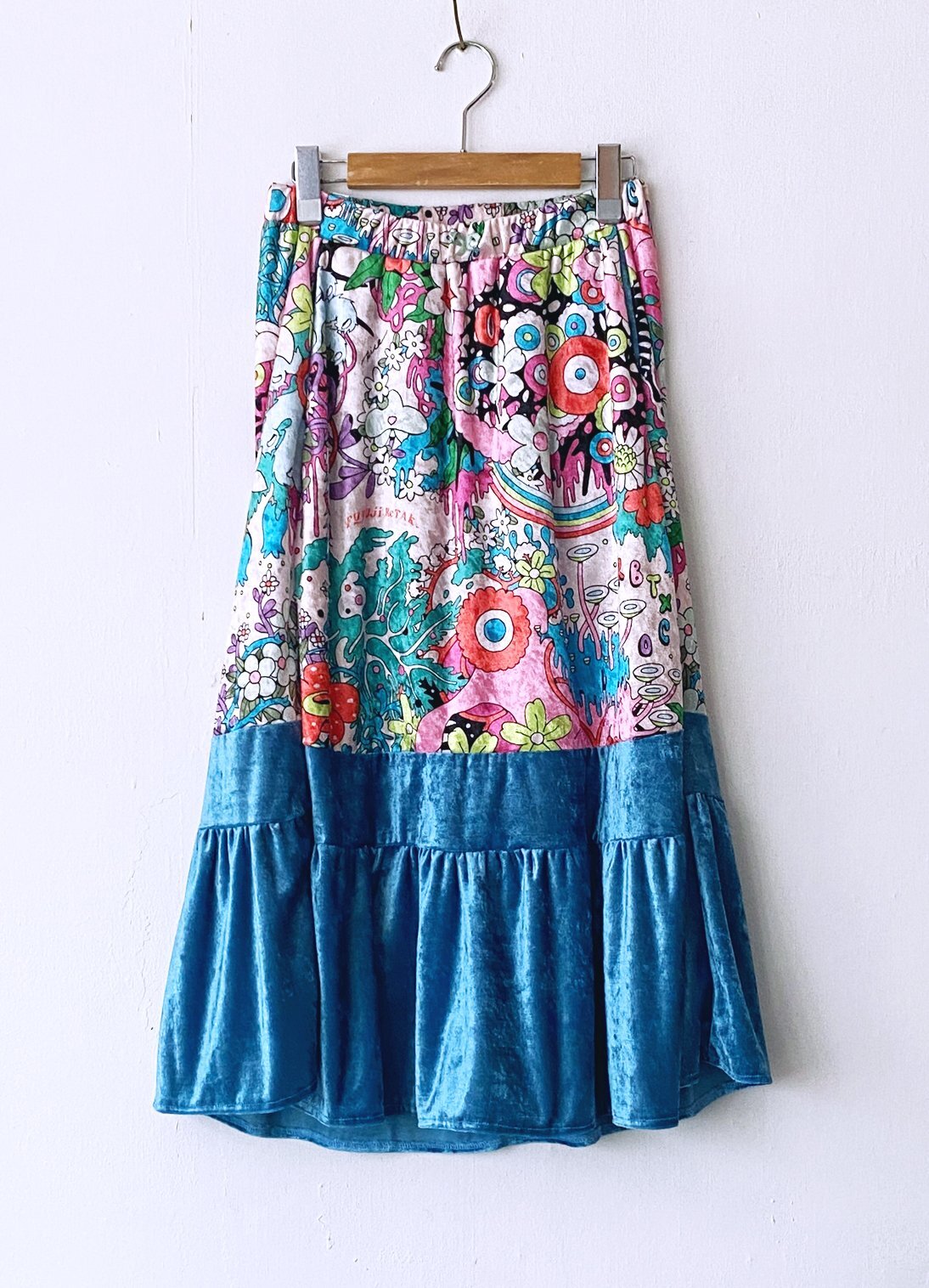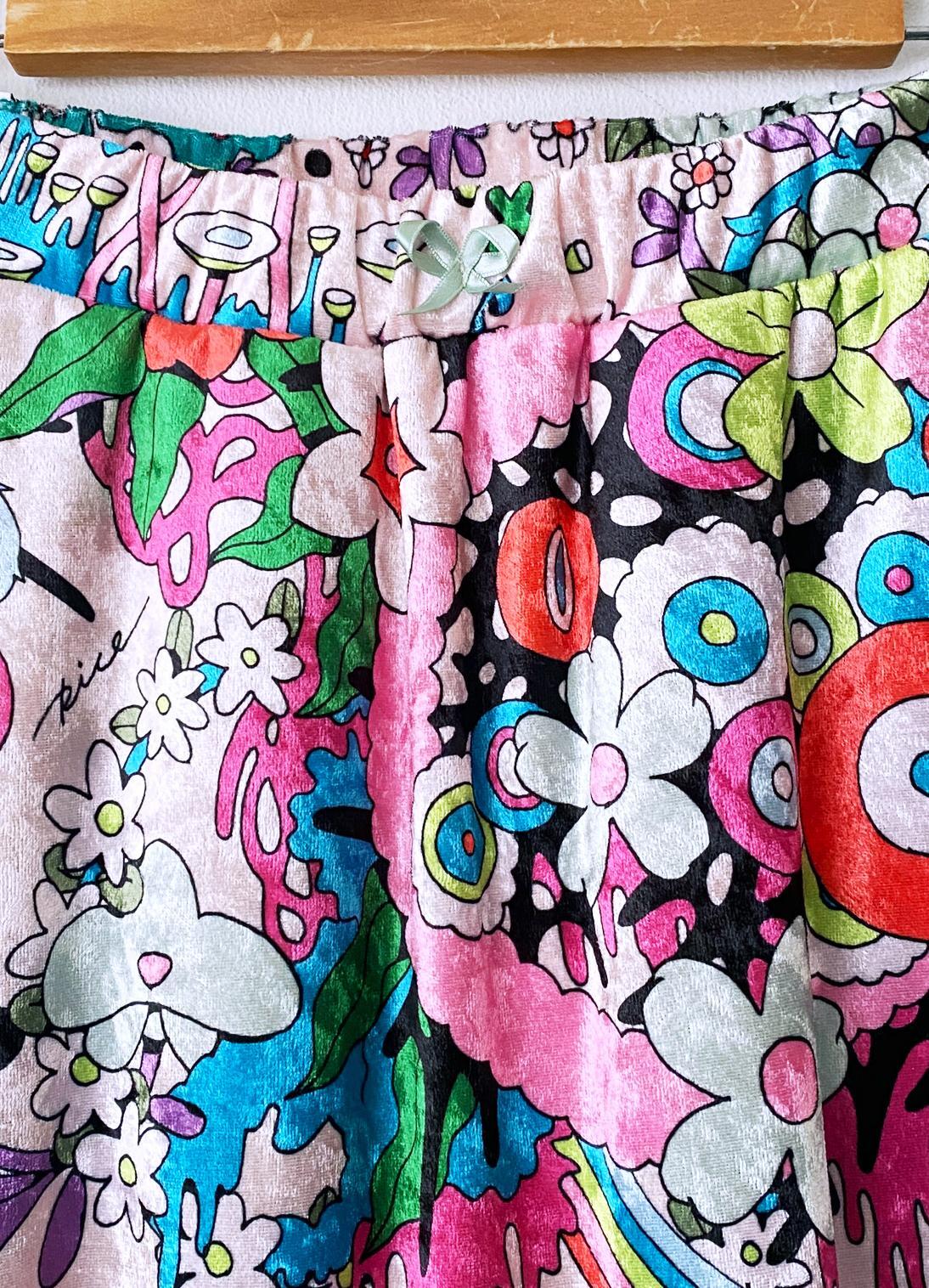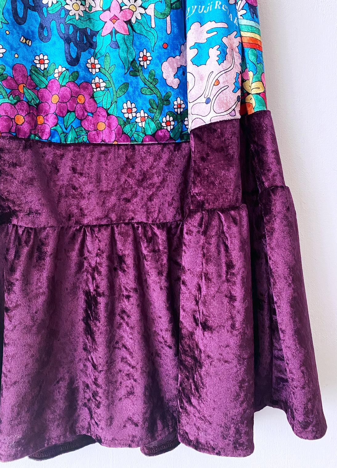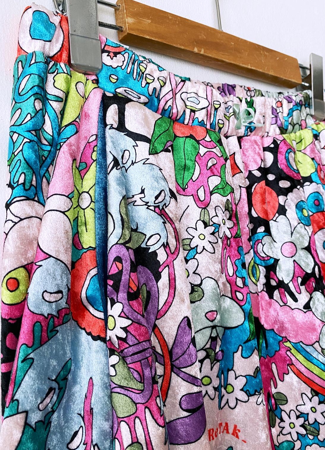 サイケデリックなレトロな柄でとてもカラフルです。裾のフリル部分は単色のベロア生地との切り替えで、エレガントな雰囲気。