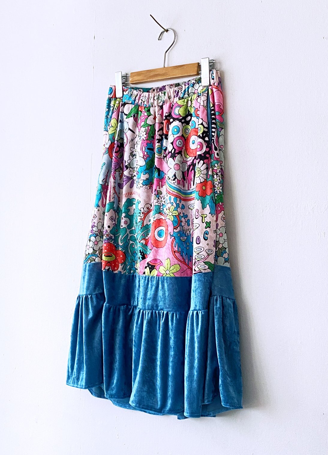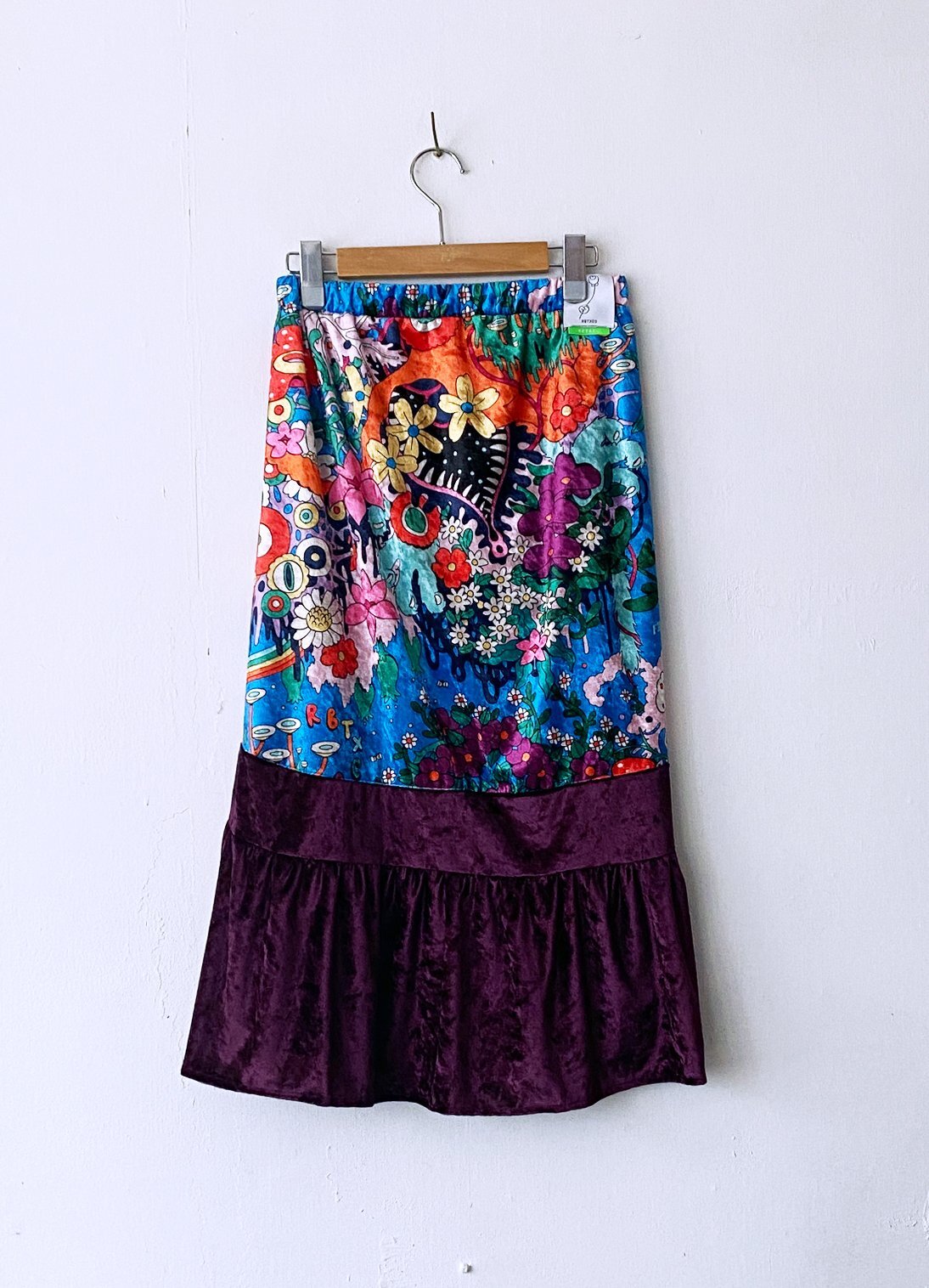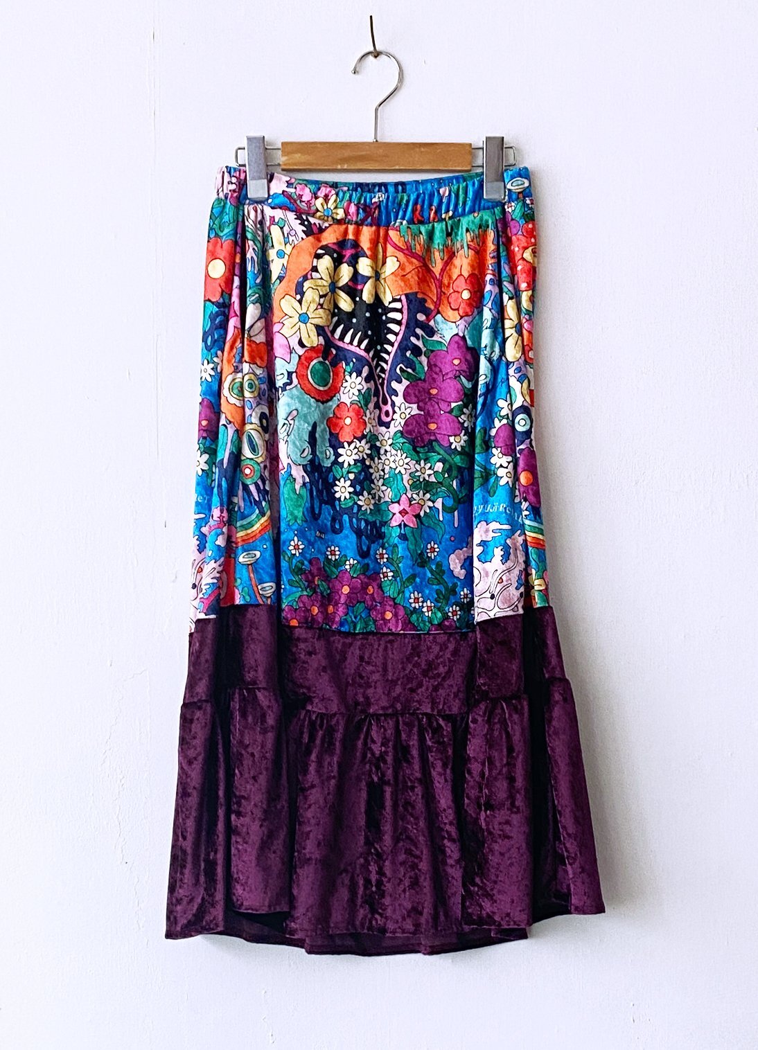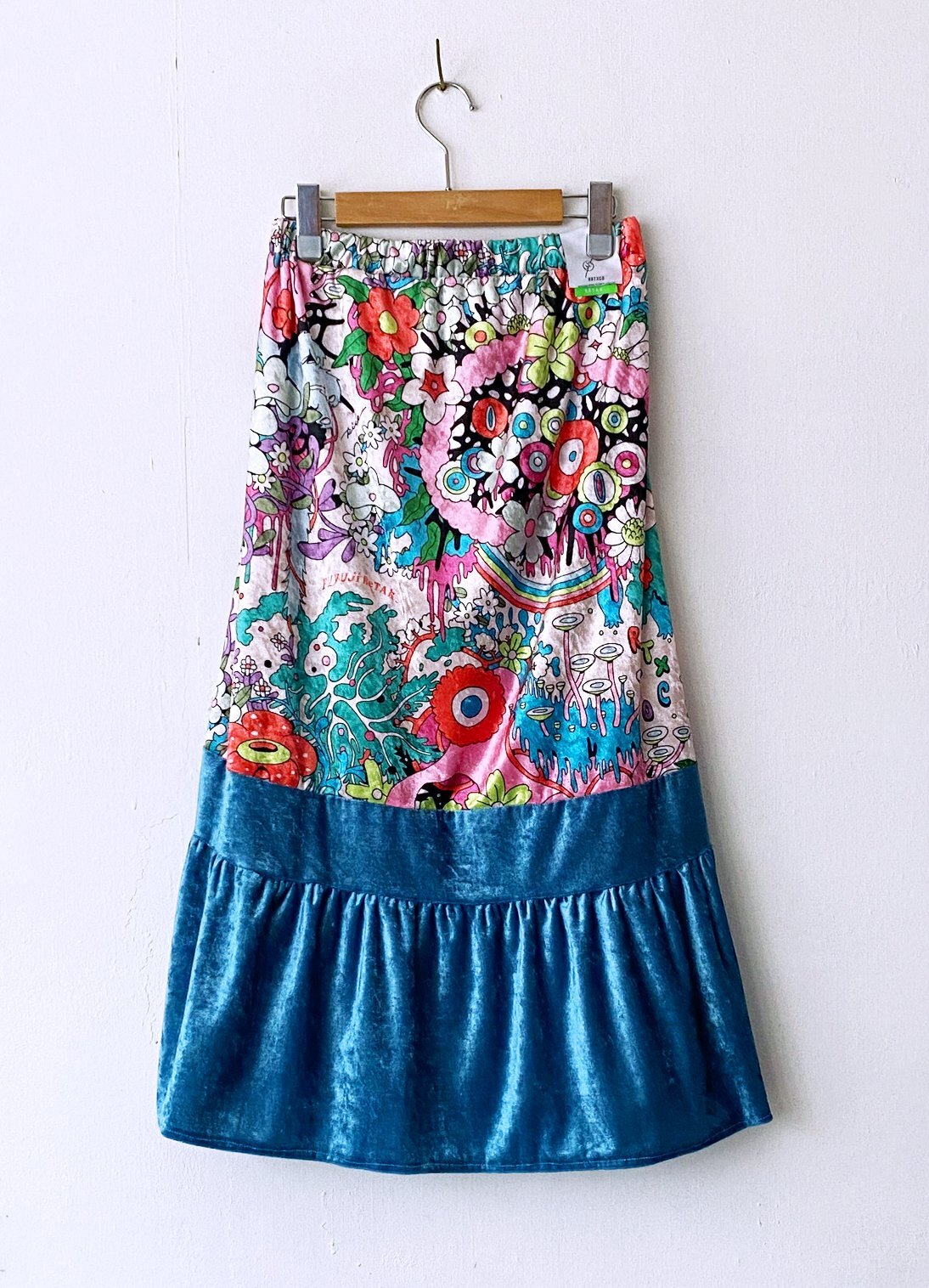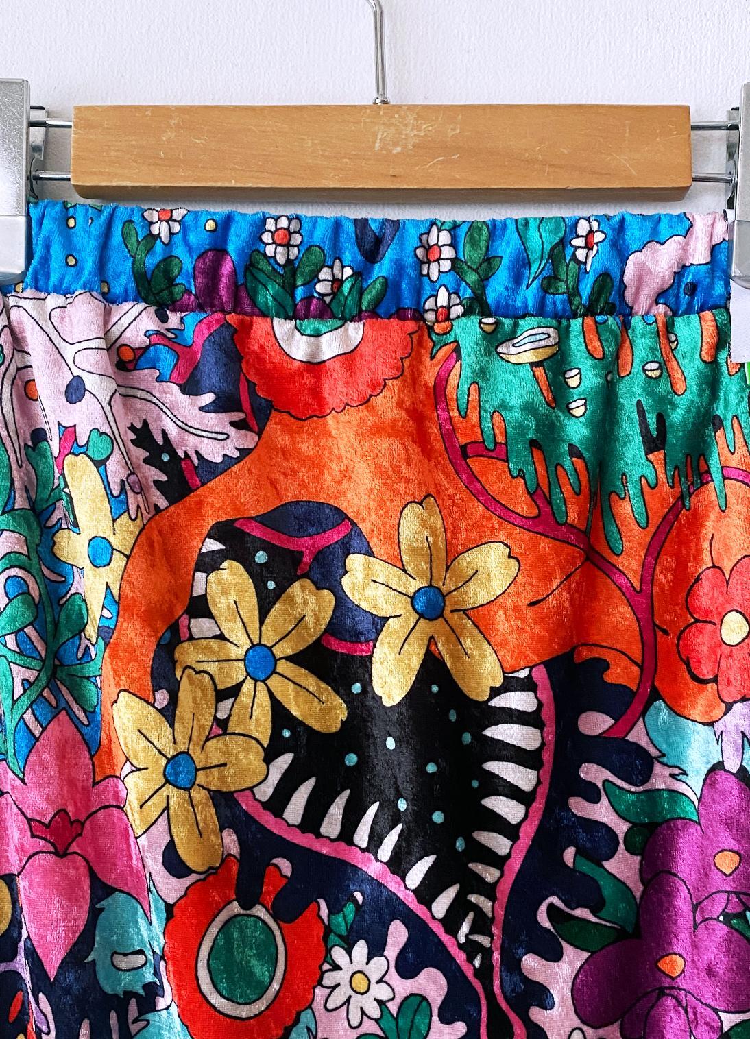 サイケデリックなレトロな柄でとてもカラフルです。裾のフリル部分は単色のベロア生地との切り替えで、エレガントな雰囲気。