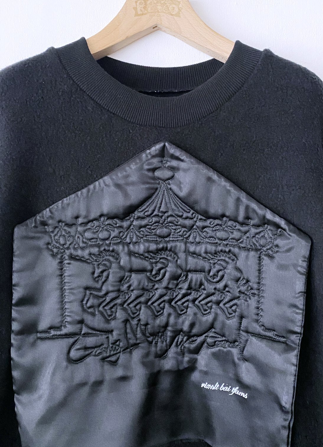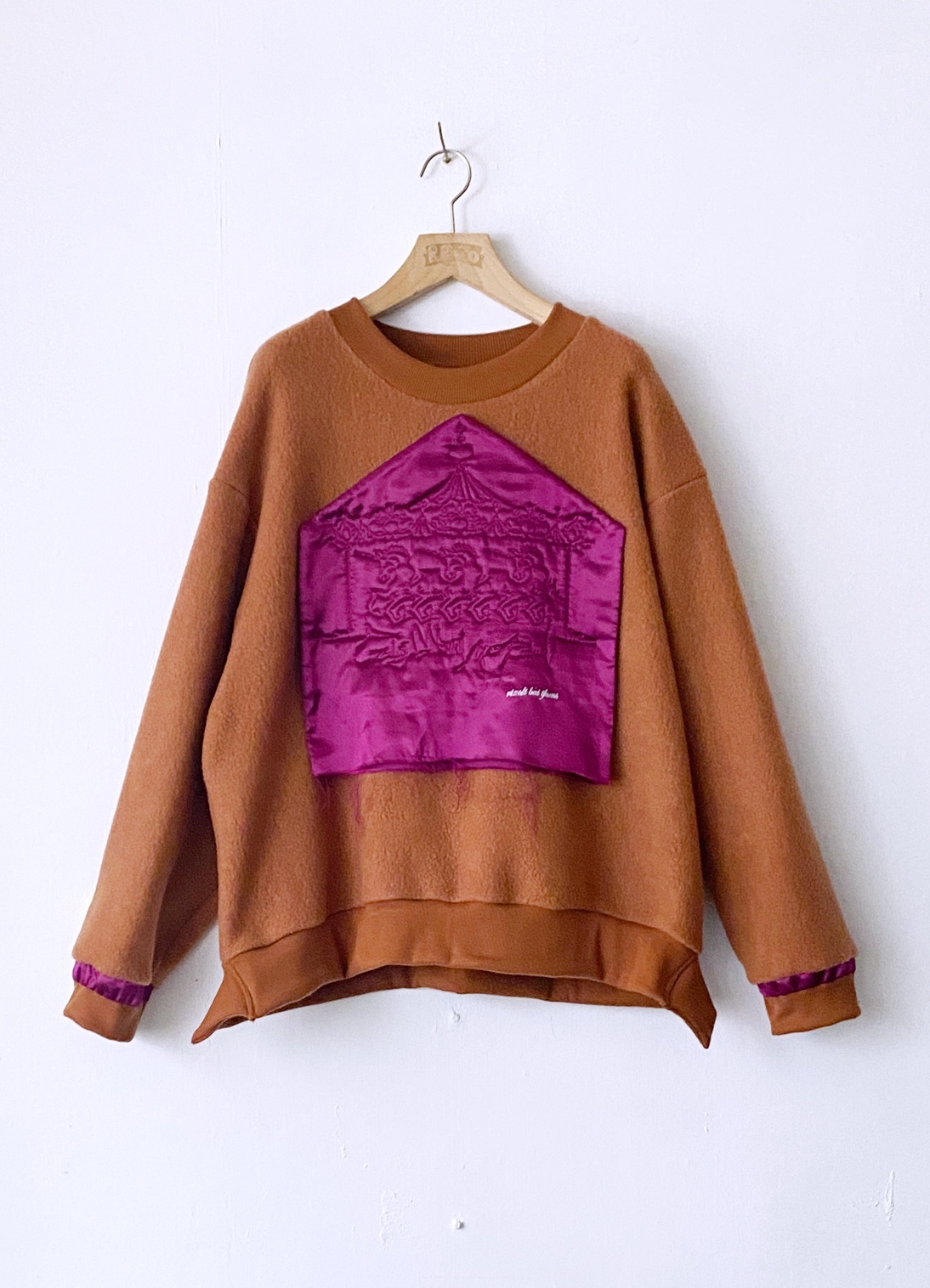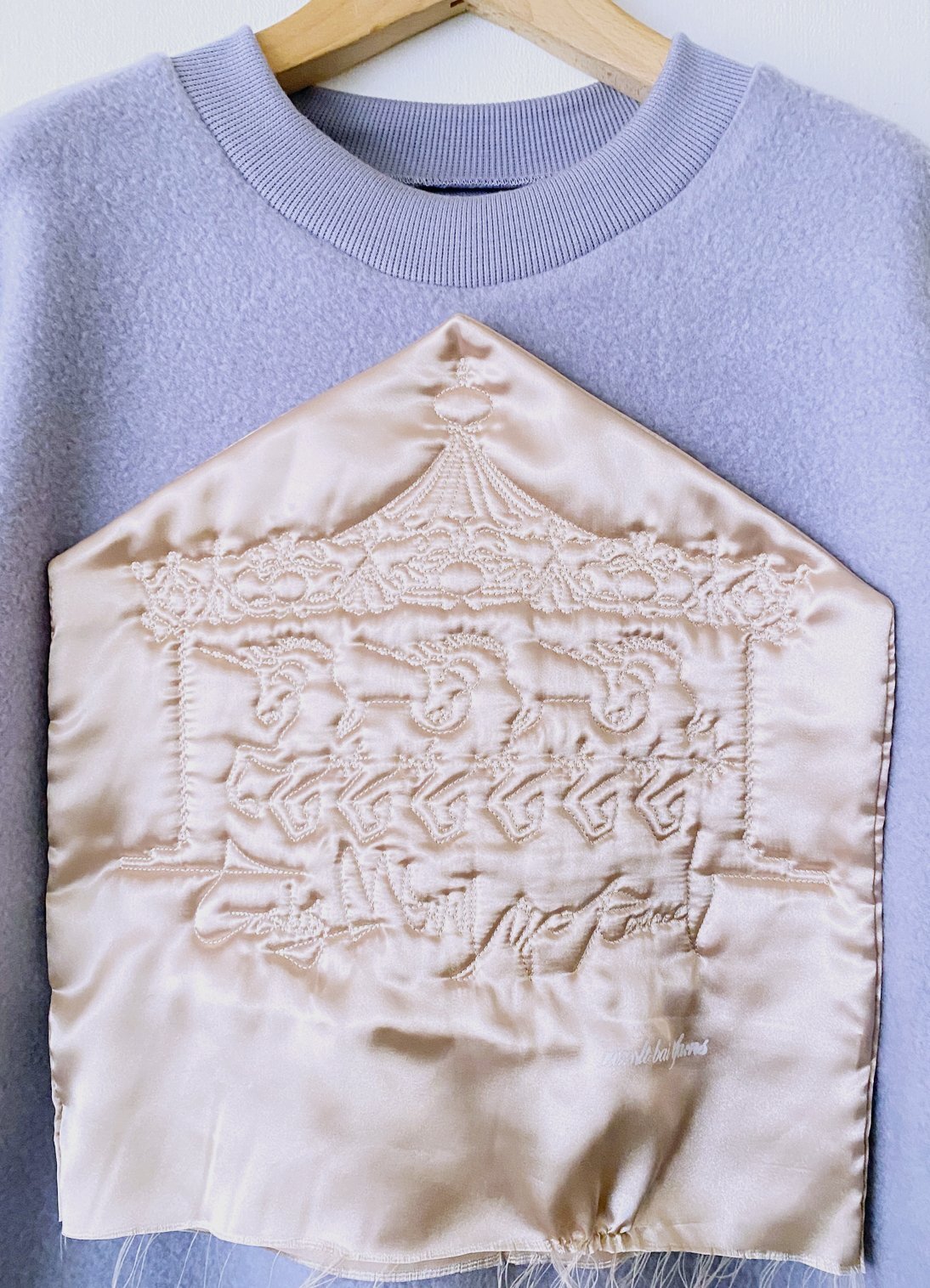 フロントのサテン生地は着るたびにほつれ、時間経過を表現していきます。(ほつれた糸はカットしてもらっても支障ありません)